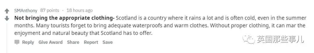 “很多来苏格兰的游客最常出现的错误就是没有带合适的衣服。苏格兰是一个常下雨而且很冷的地方,即使夏天也是如此。很多游客都忘记带防水和保暖的衣服了,没有合适的衣服真的会影响你体验苏格兰自然之美的。”