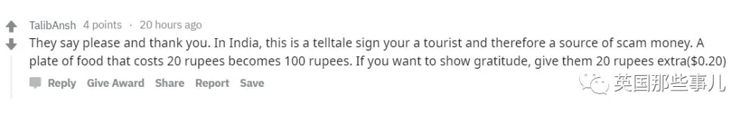 “来印度的很多人喜欢把‘请,麻烦’和‘谢谢’挂在嘴边,其实在印度我们很少说谢谢的,这样说只能让一些无良商家断定你是外国人,然后本来该买20卢比的食物他们会以100卢比的价格卖给你。在这里如果你真的想要表达谢谢,额外给对方约20卢比的小费就ok了。”