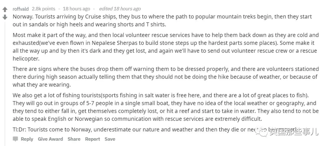 总结就是,游客们来到挪威,真的不要低估我们这里的自然环境和天气,如果你觉得登个山钓个鱼和在公园差不多的话,那么相信我你的下场估计和那些游客一样:要么出事丢了命,要么就是最后只能等到救援....”