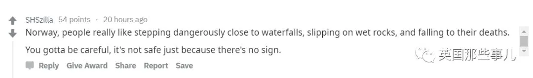 “来自挪威,我们这老会发生游客非要靠近瀑布结果从湿滑的石头上摔下去死掉的事情,