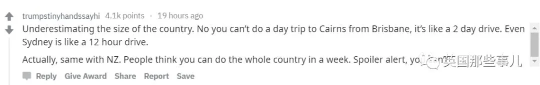 “来澳洲的很多游客可能都低估了这个国家的大小,你是绝对不可能在一天之内开车从布里斯班去凯恩斯的,这怎么说也得花上两天左右,就连从布里斯班开车去悉尼都要花大概12个小时的好吗!