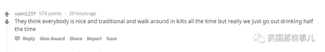 “来到苏格兰的每一个人都觉得我们这里的人很好,很传统,都穿着苏格兰短裙走来走去,但是讲真,其实我们一天中一多半时间都在外面喝酒....”