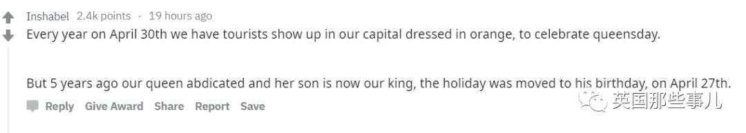 但是那个...话说5年前我们的女王就已经退位了,她儿子现在是我们的国王,所以国庆节也就移到了他生日那天,4月27日...”