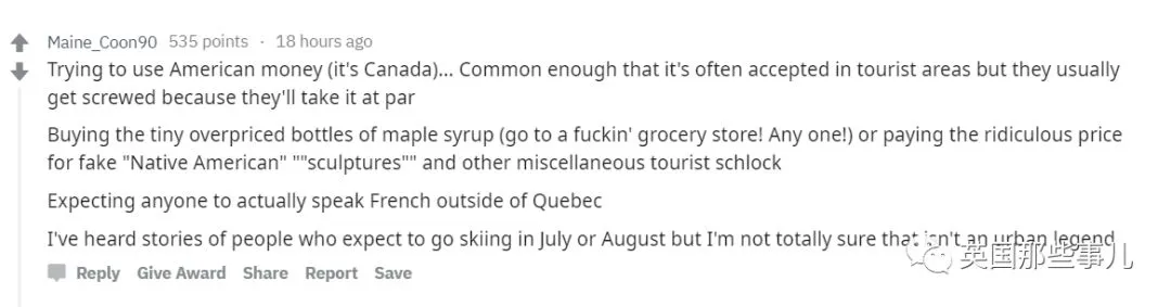 还有来加拿大花冤枉钱买那种所谓的小瓶枫糖浆,或者花钱买一些奇怪的纪念品,比如什么假的‘印第安人雕像’之类的。