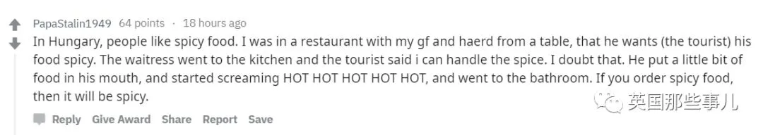 “在匈牙利人们喜欢吃辣的程度超出你的想象。我和我女朋友之前去吃饭,有一个游客想要吃辣口的,他表示自己吃辣能力还是很不错的,过了一会饭端上来,他尝了一小口立刻开始喊‘辣辣辣辣’....然后直接跑厕所去了。所以要来匈牙利的大家记住这边的辣就是真的辣,大家吃饭的时候要酌情考虑。”