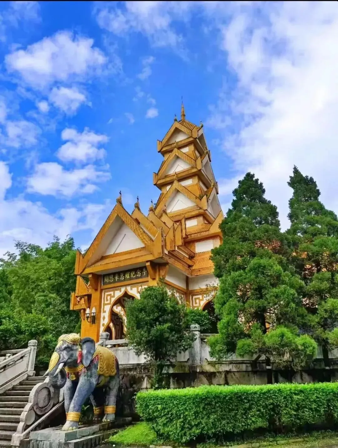 勐焕大金塔是当地的标志性建筑,也是必打卡的景点之一。勐焕大金塔座落在芒市东南部海拔一千零七十九点六米的雷崖让山顶。传说“释加牟尼”生前转世为金鸡时曾生活于此地,佛涅槃后数百年,佛教弟子“召罕大”为传播佛祖教义亲临此山修炼,为“召罕大”有个修练的好环境,野草和荆棘全部让开,故称为雷牙让山,意为野草让开的地方,尔后在此山建一佛塔,自古以来是人们公认的佛教圣地之一。只想拍照的可以走台阶到顶上,不买门票也不影响拍照,门口很多拍写真的服装店,价格也很便宜,这里很适合拍傣族写真、出片。