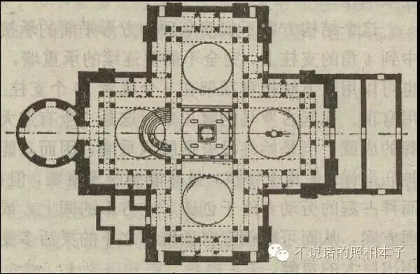 拜占庭建筑的显著特点,一,集中式的有圆形房顶(穹顶);二,希腊十字型的教堂。见下面的俯瞰图和剖面图
