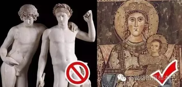 左边是古希腊古罗马高颜值、每条经络、肌肉都有力量动感的雕塑,右边是中世纪连比例都失调的呆板蠢萌2D画作。能相信是右边的比左边的晚几百年吗?课本说,一种制度取代另一种必是先进的生产力取代了落后的,然而真实的历史并非如此。西罗马被哥特人灭掉,从此开始了漫长的 1000年的黑暗中世纪,就是先进的文化被蛮荒的打败,为啥被打败,正式因为他野蛮崇尚武力。于是这些古罗马古希腊的艺术瑰宝,到了中世纪没有被传承下去,因为中世纪,宗教即是一切,并不强调人性,一切都是为宗教服务的,人,只能匍匐于宗教的脚下。而看过希腊神话的都知道,希腊神话里的诸神是有各式各样的人性特点的,也会嫉妒啦 报复啦 使诈啦,奇葩得还有那么点可爱。