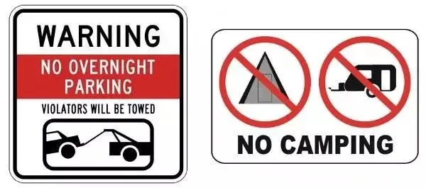 所有贴有“禁止停车”(No Parking)、“禁止停车过夜”(No Overnight Parking)、“禁止露营”(No Camping)等类似标志的地方,都不允许停车过夜。