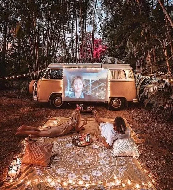 海边看日落、夕阳,在森林里野餐,去沙滩上嬉戏,到国家公园探险露营,甚至拉起了帷幕放起了露天电影。