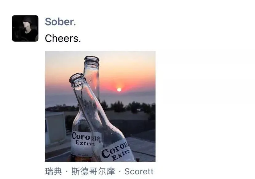 定位+配图一定要不着痕迹。最好是有一天突然在朋友圈发现你,而你已经在斯德哥尔摩畅饮着啤酒了。