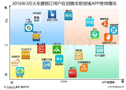 将火车票预定用户与招聘求职领域APP交叉分析得知:前程无忧51job、智联招聘、猎聘同道等六款应用渗透率较高且用户使用较为偏好,说明以上的应用在用户中受到广泛的使用,且用户粘性较高。应用主要集中在一三象限,第三象限应用在用户体验及用户覆盖等方面的竞争力有待提高。▼