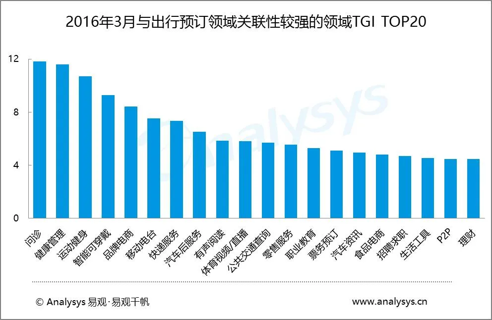 出行预订相关性最强的领域为:问诊、健康管理、移动电台、有声阅读、公共交通查询、汽车资讯等,说明出行预订用户关注医疗健康,也偏好移动电台等资讯获取类应用。