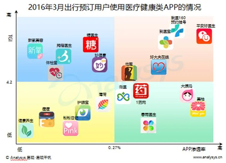 综上可知,出行预定APP可以考虑与“平安好医生、好大夫在线、就医宝”等医疗健康类APP以及“凤凰新闻、喜马拉雅FM、蜻蜓FM、汽车之家”等移动电台、资讯应用进行联合营销或市场推广等动作,从而获得高质量用户。