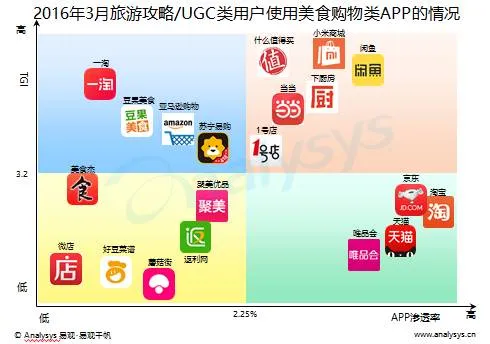 将旅游攻略/UGC类用户与美食购物类APP交叉分析得知:闲鱼、1号店、下厨房、当当等六款应用渗透率较高且用户使用较为偏好,说明以上的应用在用户中受到广泛的使用,且用户粘性较高。相比于第三四象限,以美食知识分享或其余电商零售服务为主,虽然用户渗透率高,但用户电商购买偏好仍有待提升。▼