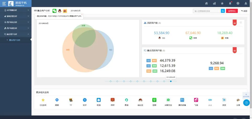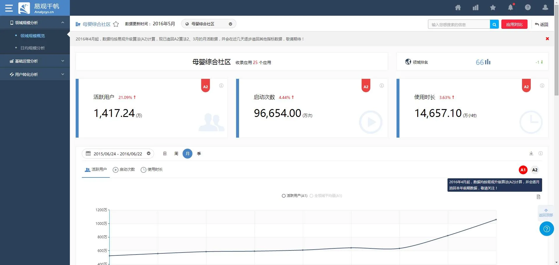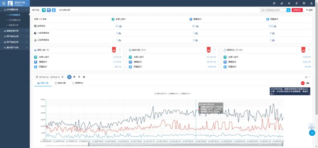 易观千帆是易观旗下基于海量移动互联网用户行为数据进行挖掘的大数据产品。 旨在分析各类APP的运营情况、分析用户行为特征,建立客观、权威的移动应用评级, 为客户提供内部运营决策支持和外部竞争对手分析的服务。