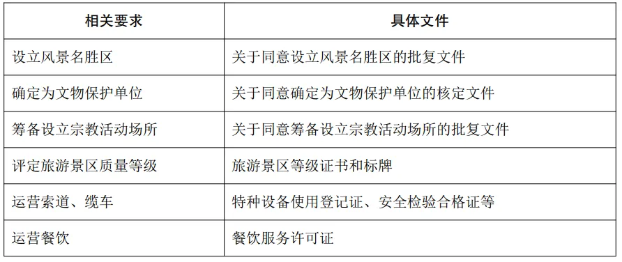 除《基础设施领域不动产投资信托基金(REITs)试点项目申报材料格式文本》所列示的基础设施项目投资管理手续合规性文件以外,景区类型资产的开发建设经营过程中可能还涉及以下文件: