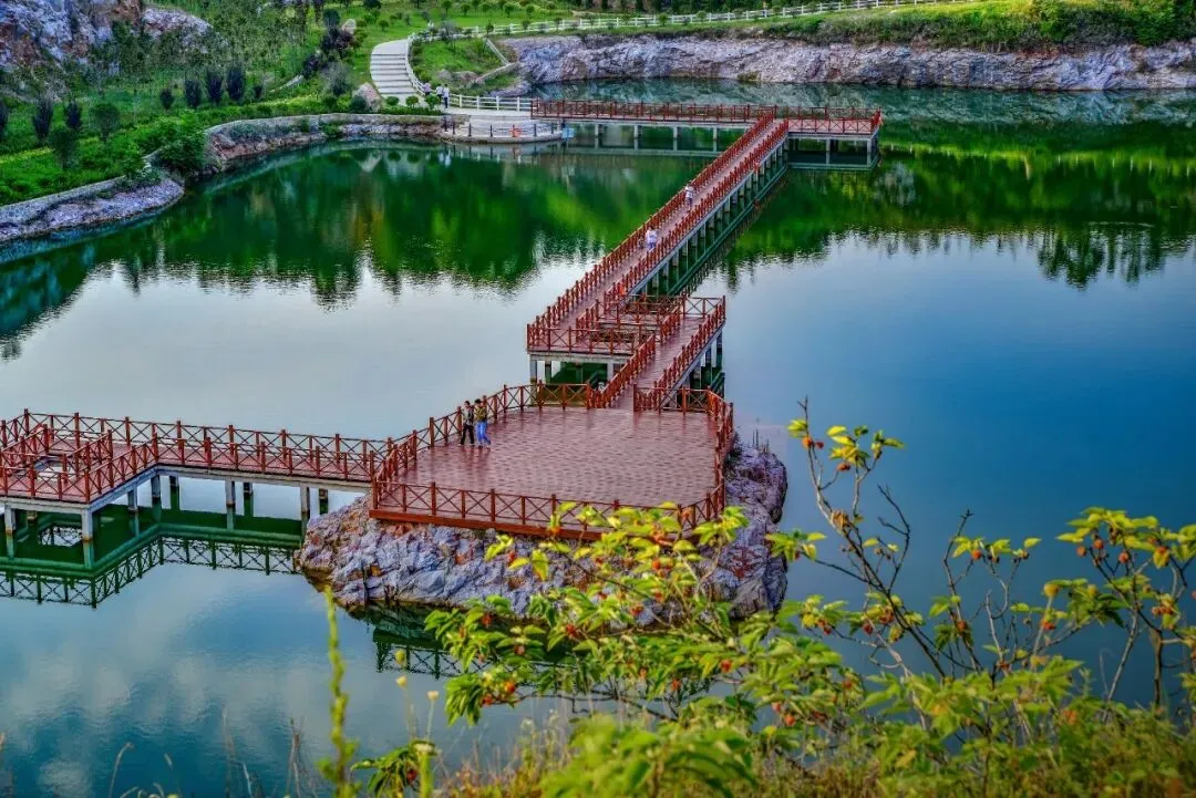 全身采用木质架构,总长约200米。游客漫步水上栈道,视野开阔,不同的季节可以观赏不同的美景。春天栈道两岸层峦叠翠,群峰莽莽,鸟语花香,蜂飞蝶舞;夏天水光潋滟,山色空濛,凭栏远眺,白云幽幽,湖天一色;秋天斑斓锦鲤逗趣嬉戏,忠贞鸿鹄悠然畅游、绚丽鸳鸯双栖双宿;冬天白雪皑皑,银装素裹,让人仿佛进入了仙境,这里也是矿山公园内网红打卡点之一。