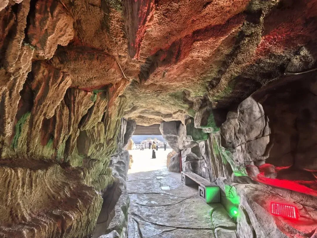 通过洞口两侧山体雕塑,使之与临近山体巧妙衔接,融为一体。“滴水洞”作为“濮公山八景”之一,有着其独特的风情与魅力,通过洞内人为景观钟乳石石柱、石幔、石花、石笋以及石瀑等雕塑景观,还原了濮公山石灰岩地区溶蚀形成的溶洞景观。洞中精心雕琢了各式各样的钟乳石,洞壁布着各色灯带,整体不显昏暗,彩光虽不明亮,却也柔和,在保证游客安全的前提下,又多了几分迷蒙的色彩,加上洞中滴水折射,显得格外玄幻。
