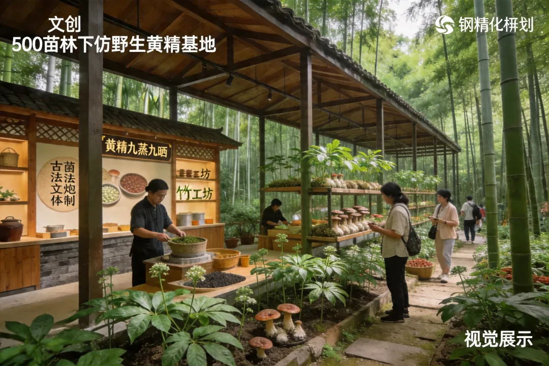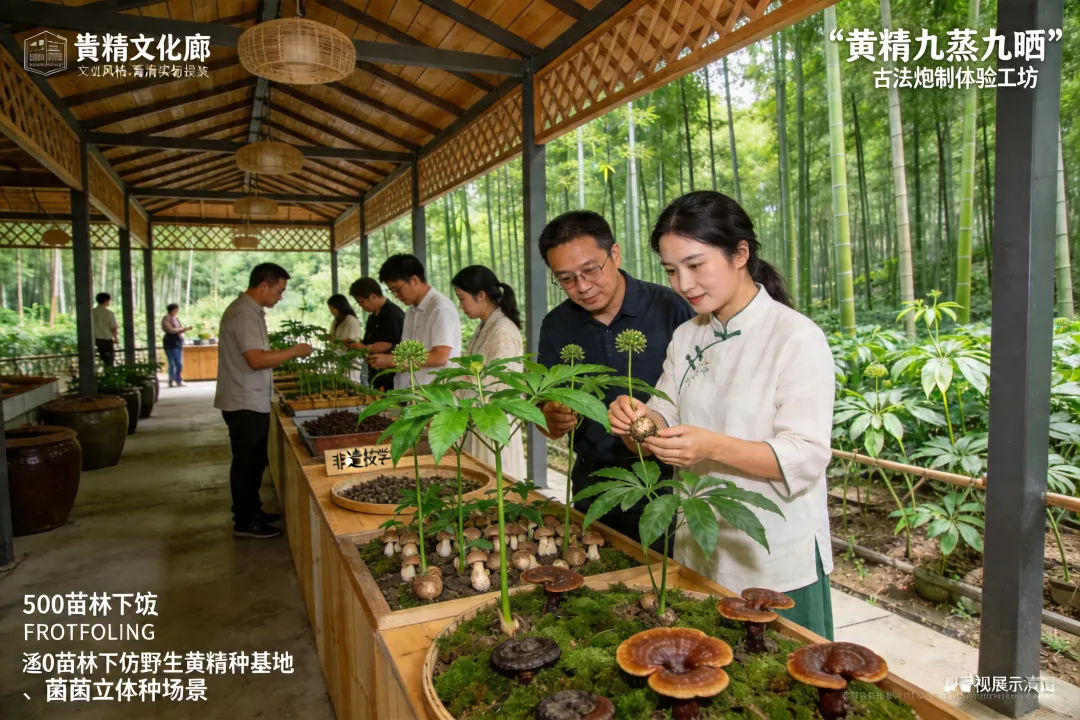 林下黄精种植示范区规划500亩林下仿野生种植基地,采用“黄精-竹林-菌类”立体种植模式,配套建设黄精文化长廊、古法炮制体验工坊。结合《神农本草经》典故,设计“黄精九蒸九晒”非遗技艺展示区,开发黄精科普研学课程。