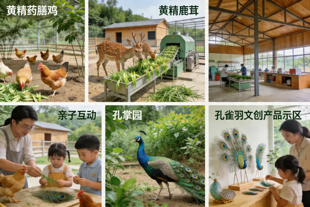 生态养殖融合区建设“黄精药膳鸡”“黄精鹿茸”等特色养殖园,利用黄精茎叶制作青贮饲料,形成“药材-饲料-养殖-药膳”闭环。同步规划孔雀观赏园,开发孔雀羽文创产品,增强亲子互动体验。