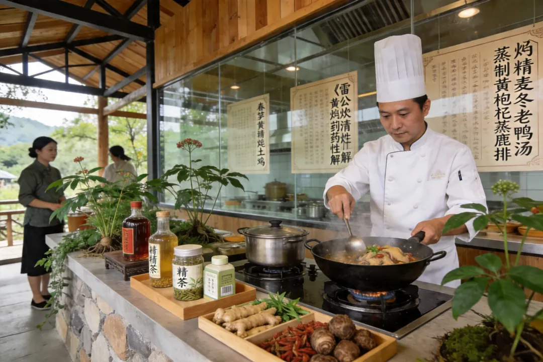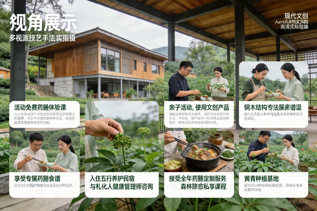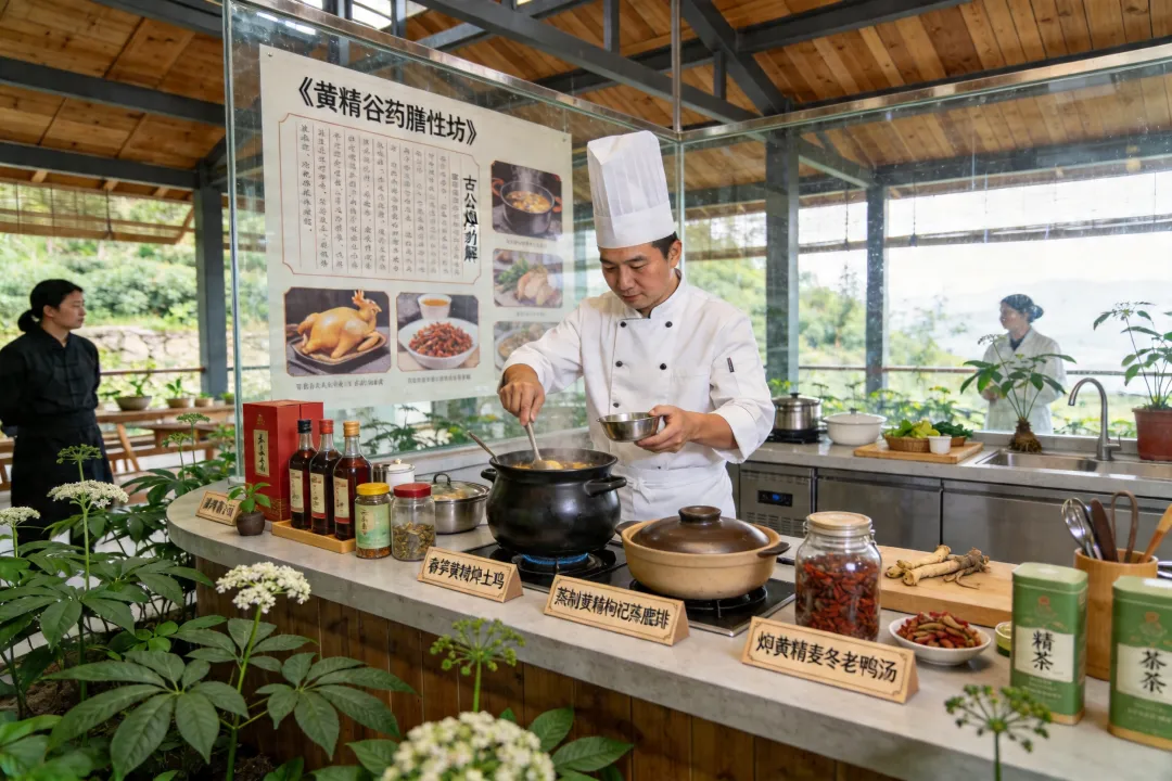 黄精谷药膳工坊开发“黄精十宴”:春笋黄精炖土鸡、黄精枸杞蒸鹿排、黄精麦冬老鸭汤等时令药膳,配套黄精酒、黄精茶等衍生品。设置透明厨房,展示《雷公炮制药性解》记载的古法烹饪技艺。