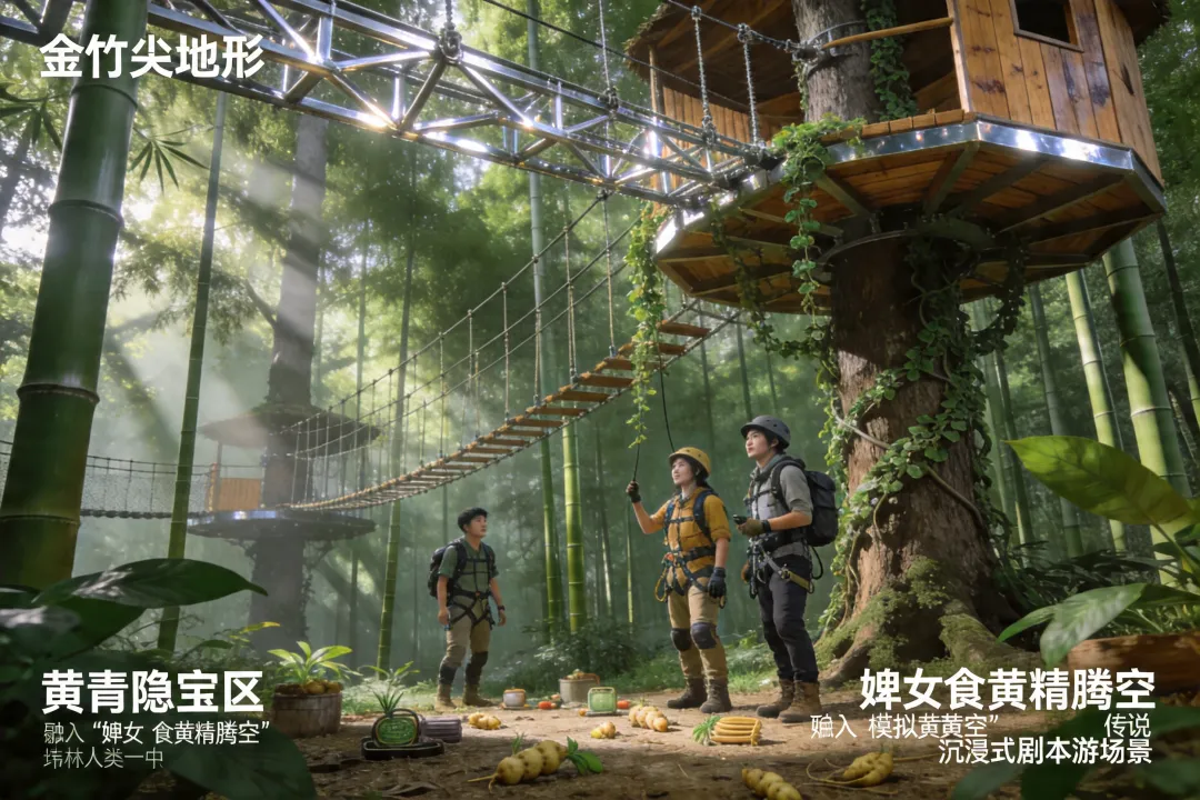 丛林穿越探险区利用金竹尖地形建设高空滑索、树屋探险、黄精寻宝等项目,融入《稽神录》中“婢女食黄精腾空”传说,设计沉浸式剧本游,增强游客参与感。
