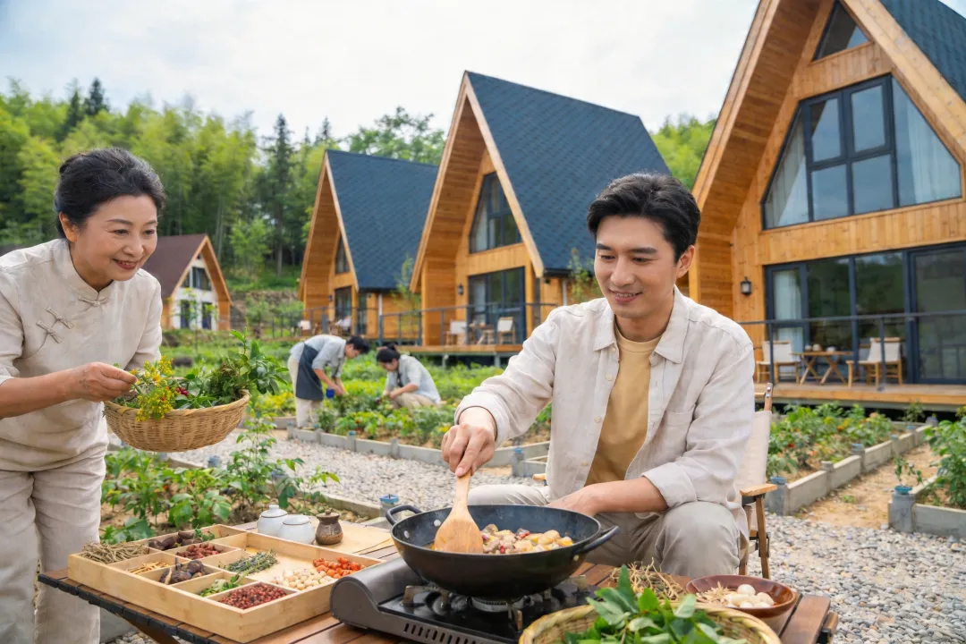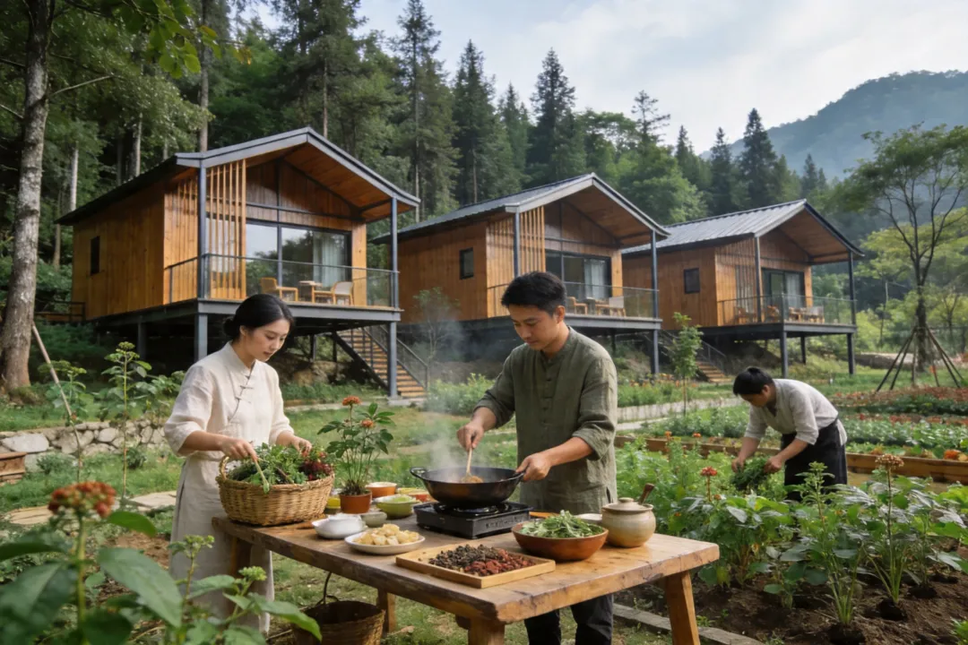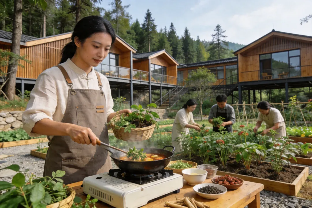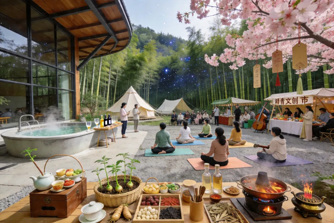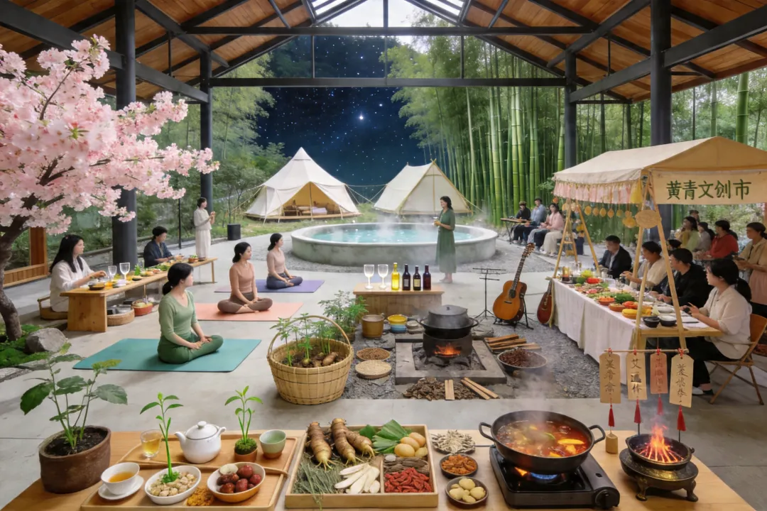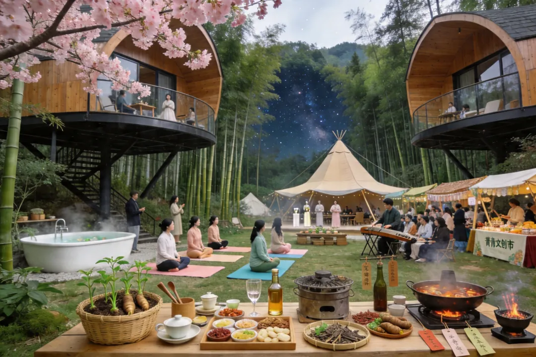 五行康养民宿集群依山势布局金(矿物疗愈)、木(森林木屋)、水(水库观景)、火(艾灸温阳)、土(黄精药膳)主题民宿。每栋民宿配置药浴池、冥想室,提供《本草纲目》记载的“黄精四时养生方”定制服务。