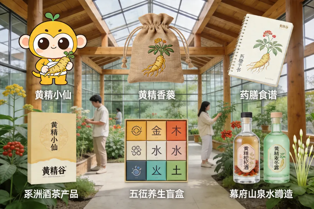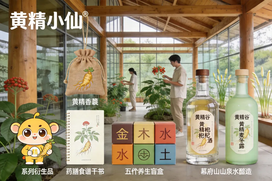设计“黄精小仙”卡通形象,开发系列衍生品:黄精香囊、药膳食谱手账、五行养生盲盒。 推出“黄精谷”品牌酒类产品:黄精枸杞酒、黄精麦冬露,采用幕府山山泉水酿造。