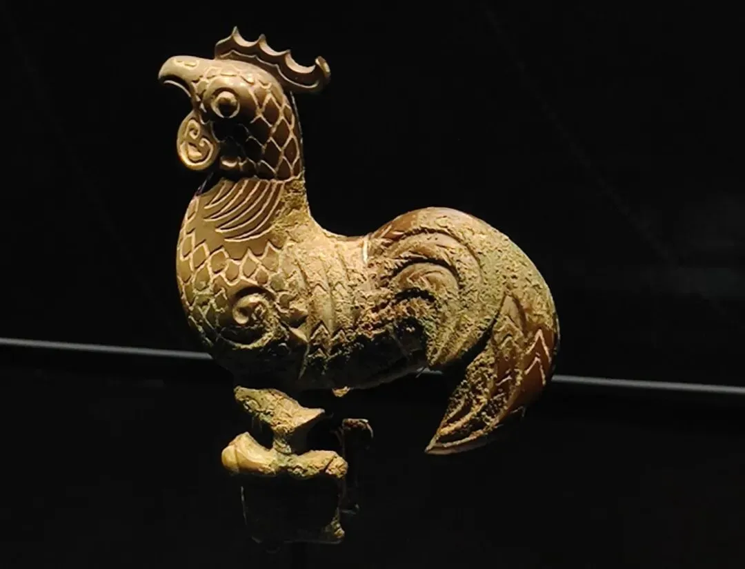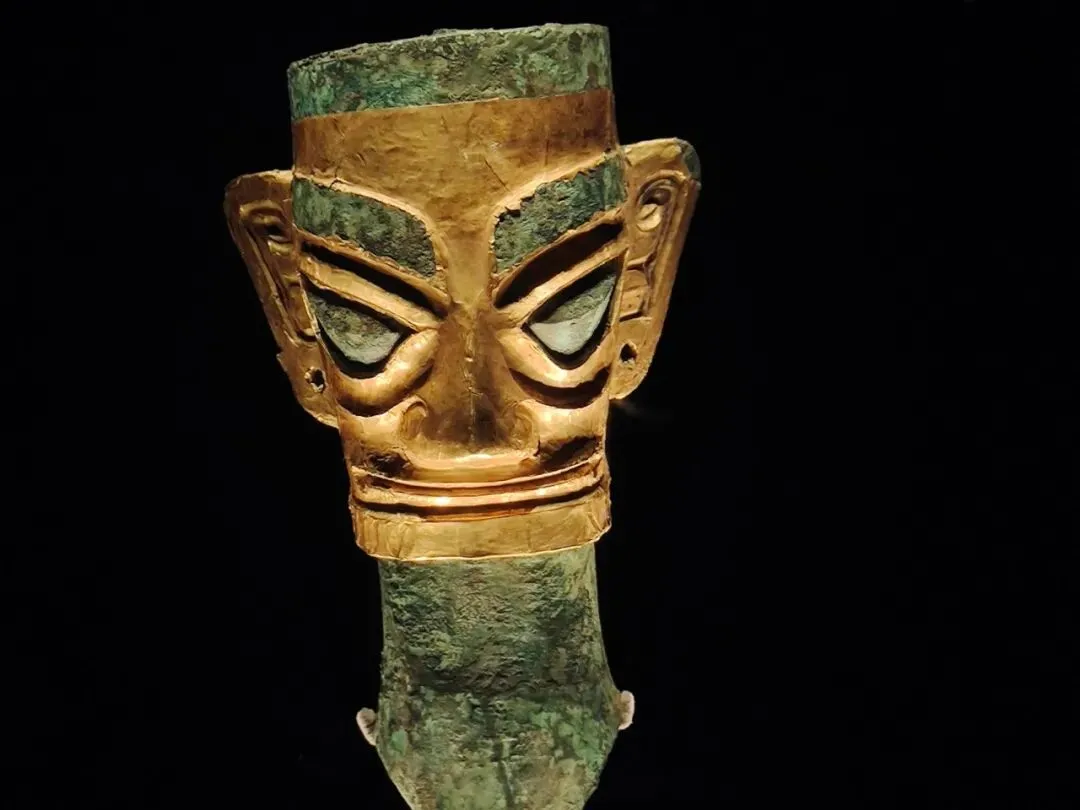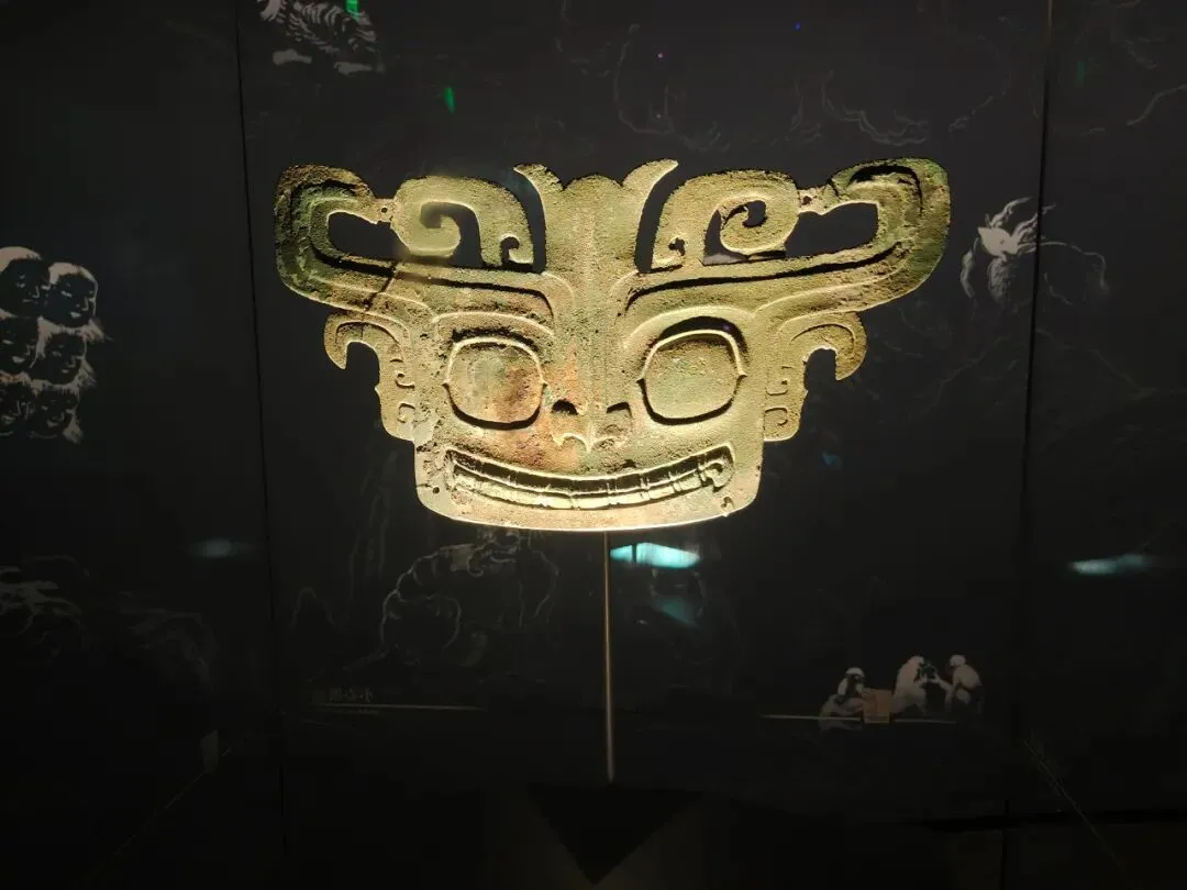 青铜馆里面是一些青铜器。比较著名的有青铜太阳轮、戴金面罩青铜人头像、青铜纵目面具。还有青铜神鸟、青铜鸡等。