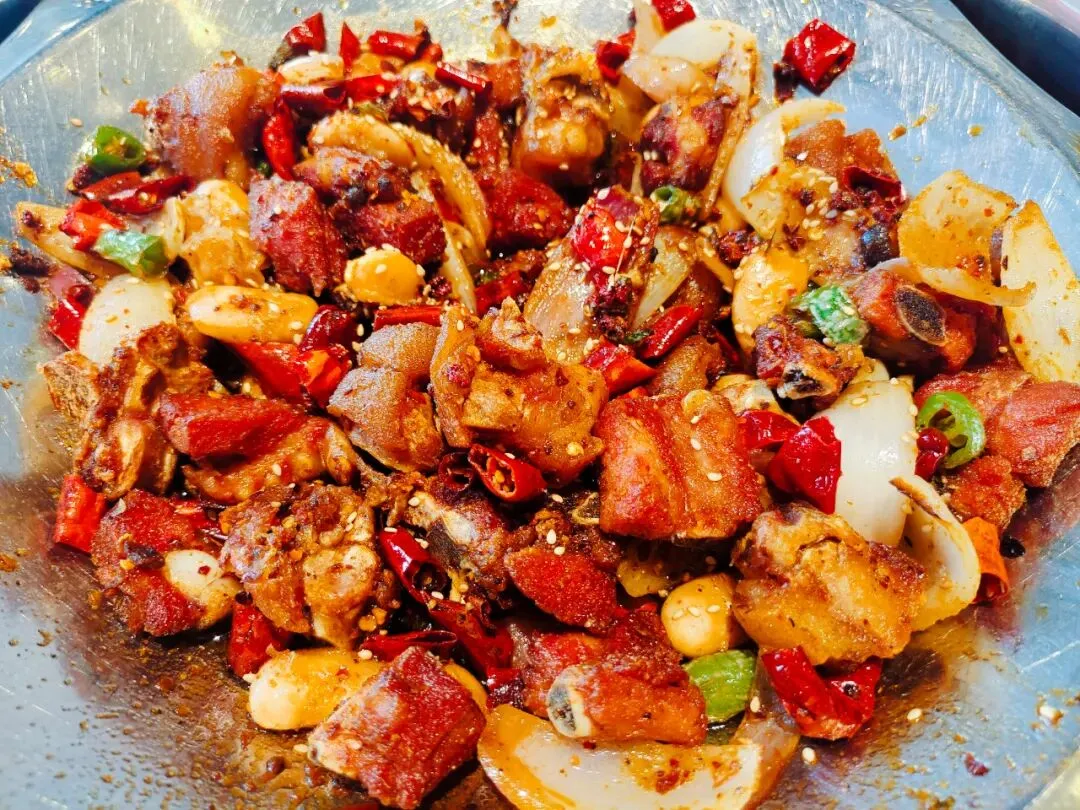 逛完三星堆,可以尝一尝当地的干锅。距离三星堆十分钟车程的北海路上有一家味道鲜兔头干锅,旁边还有一家香味轩干锅。兔头,是这里的一大特色。干锅麻辣鲜香,配菜丰富,味道绝美。