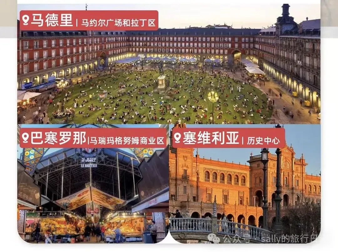 📍马德里:作为西班牙的首都,马德里是王室气度与艺术脉搏的共振之地。普拉多博物馆里珍藏的戈雅和委拉斯开兹名作,与皇宫的金碧辉煌交相辉映;而太阳门广场的零公里标志和圣米格尔市场的烟火气,又让这座欧陆最南端的首都多了几分接地气的热情。