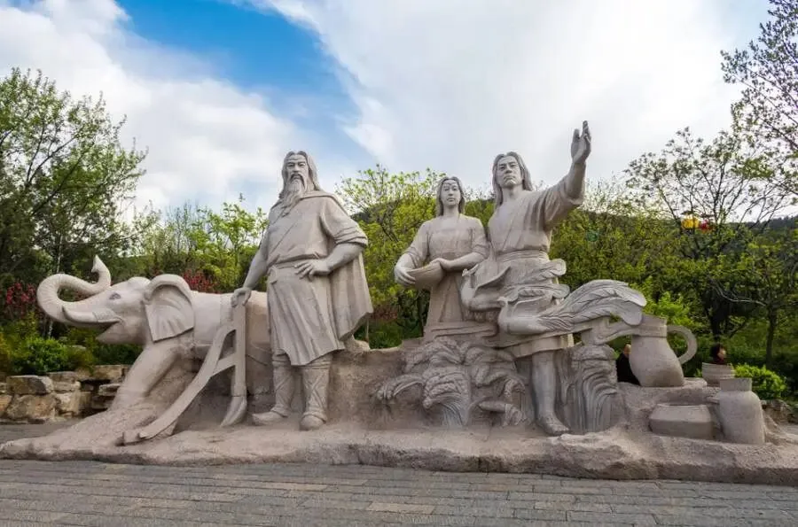 雕塑生动再现了上古时期舜帝躬耕历山的经典画面,核心由三个人物、一头大象构成。