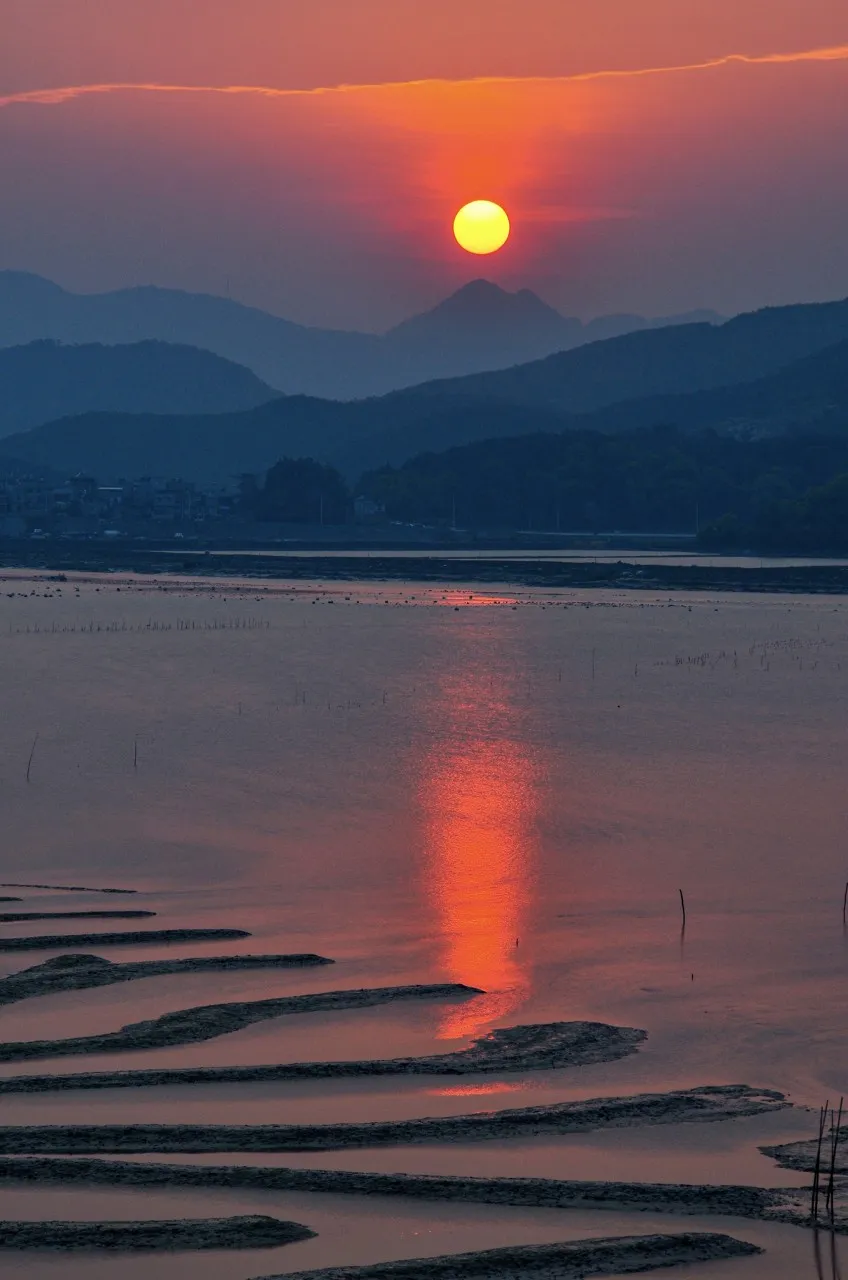 霞浦的滩涂,是一幅会随着光影变化的画卷。日出时分,金色的阳光洒在海面上,渔民们撑着竹筏在紫菜架间穿梭,恍如一幅流动的油画。日落时分,天空被染成橙红色,倒映在平静的海面上,美得让人想哭。