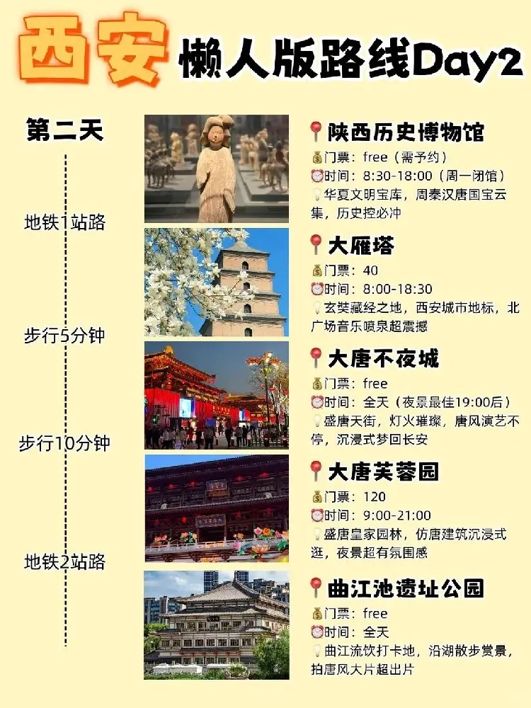 陕历博、兵马俑需提前3-5天予约,节假日别跑空;昼夜温差大,带薄外套,汉服拍古城、不夜城超出片;避开景区网红店,认准本地老店不踩雷,轻松玩转西安。