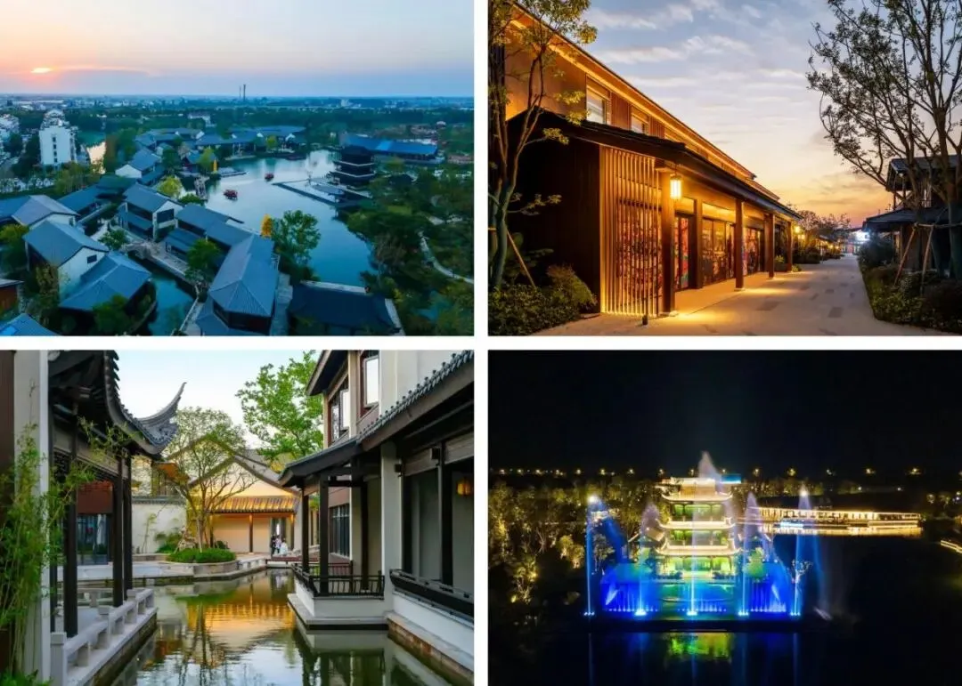 傍晚移步紧邻老街东首的固城湾,璀璨光影映照亭台楼阁,重现“三湖绕城”之景。乘摇橹船夜游“一字水街”,灯影水光间尽显江南水乡的温婉静谧。