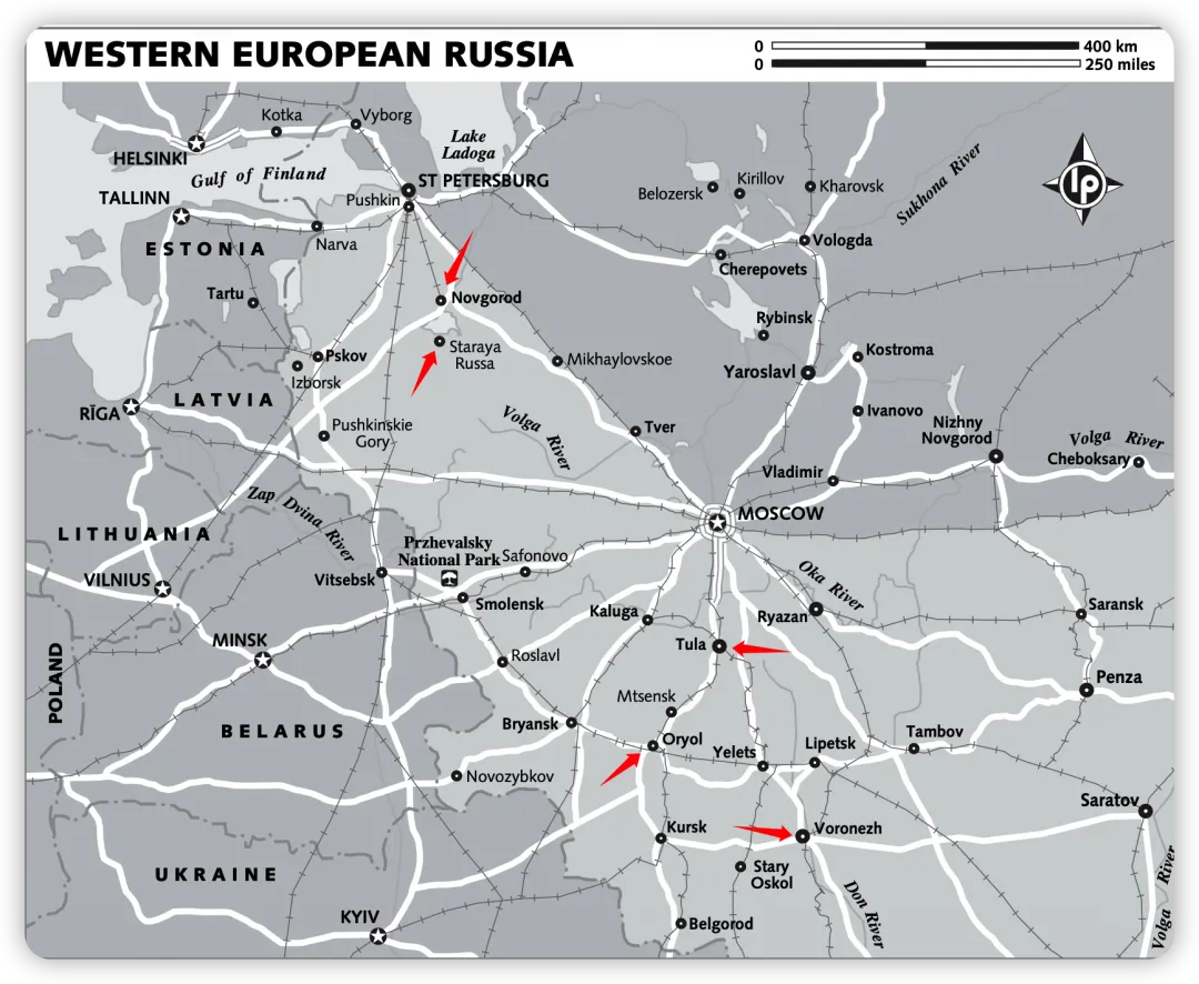 具体线路为:萨拉托夫Saratov - 伏尔加格勒Volgograd - 沃罗涅日Voronezh - 奥廖尔Oryol – 图拉Tula – 老鲁萨Staraya Russa - 大诺夫哥罗德Novgorod。