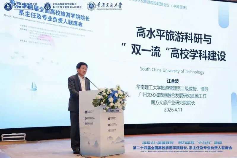 2026年4月10—12日,第二十四届全国高校旅游学院院长、系主任及专业负责人联席会在重庆隆重召开。本次会议由教育部旅游管理专业国家虚拟教研室、全国高等学校旅游院校联盟、重庆交通大学联合主办,以“人工智能+”视域下“十五五”高等旅游教育革新与高质量发展为核心主题,汇聚全国百余所高校旅游院系负责人、学科带头人、业界专家与行业精英,共同探讨新时代旅游高等教育的转型路径、学科建设、人才培养与产教融合等关键议题。华南理工大学旅游管理系江金波教授、旅游管理系/旅游发展与规划研究院副院长李沐纯教授、魏卫教授、博士后牟婉瑜、彭婷婷共五位老师参会,与全国同行深入交流、积极发声,充分展现了华南理工大学在旅游管理学科建设、人才培养与学术研究领域的综合实力与前沿视野。