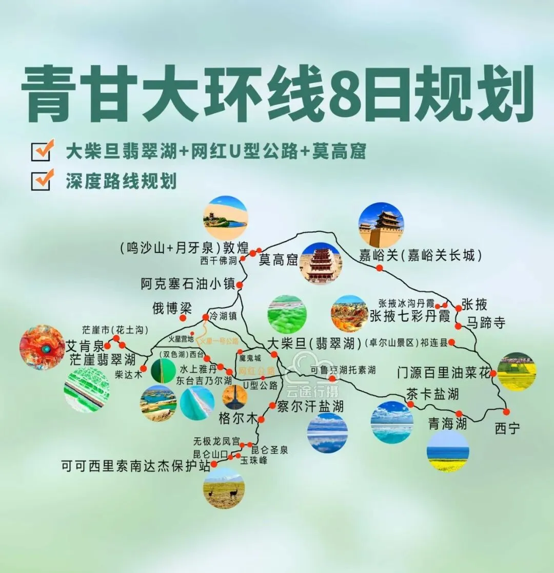 ·路线:西宁→青海湖→茶卡盐湖→大柴旦→敦煌→嘉峪关→张掖→祁连→西宁。