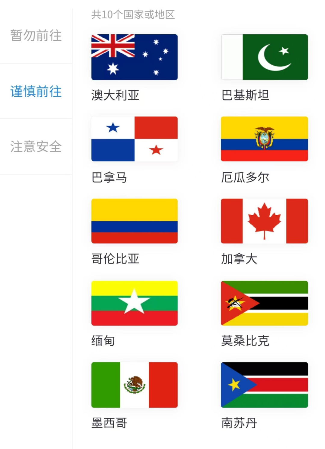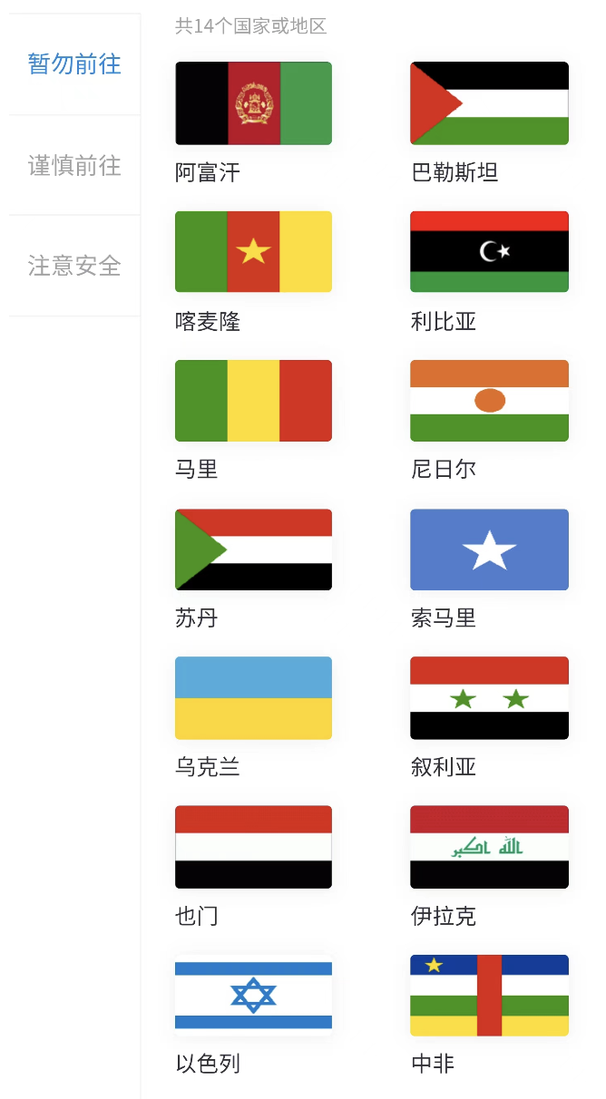 您现在的位置是:首页 > 国内旅游目的推荐 > 正文 国内旅游目的推荐 海外旅行风险等级提示(3月1日更新) admin2024年03月01日 17:01:25国内旅游目的推荐110 【 使领馆提示 】海外旅行安全风险等级- 截止2024年3月1日最新消息 -外交部提醒计划出国及已在国外的中国公民和机构,务必及时查看前往或所在国家风险等级和安全提醒,做好相应安全防范,确保自身安全。目前海外旅行安全风险等级如下:暂勿前往国家、谨慎前往国家、需注意安全国家清单如下图所示:暂勿前往国家:谨慎前往国家:需注意安全国家:埃塞俄比亚、 秘鲁、刚果(金)、黎巴嫩以上资讯来自中国领事APP 转载请说明来源于"旅荐网",部分内容转载自网络,如有侵权请联系qlwl@foxmail.com删除 本文地址:https://www.15386.cn/post/15537.html 上一篇 二幼教师讲故事 | 《母鸡的旅行》 下一篇 2024 年百里杜鹃景区杜鹃花花期预测 相关文章 县防控办紧急提醒:减少跨省旅游,及时报告个人涉疫事项 厦门春季旅游攻略:春风正好,赴一场山海与繁花之 旅游策划中的体验设计:让游客有参与感、有获得感 2026年3月18日海南旅行机构信誉档案 2026年安心出游完整名录 桂林四天三晚自由行攻略 隽健旅行vlog|����槟城怎么玩?跟着我 一个人,云南旅行26天攻略(详细版) 马蜂窝发布2026AI+旅游报告:AI搜健康卫士出行包,解锁春季无菌 大同一日游攻略 | 云冈石窟、应县木塔、悬空寺一站式游玩 5 座免费宝藏古镇旅行指南!人少景美不花钱 发表评论 取消回复 评论列表 这篇文章还没有收到评论,赶紧来抢沙发吧~