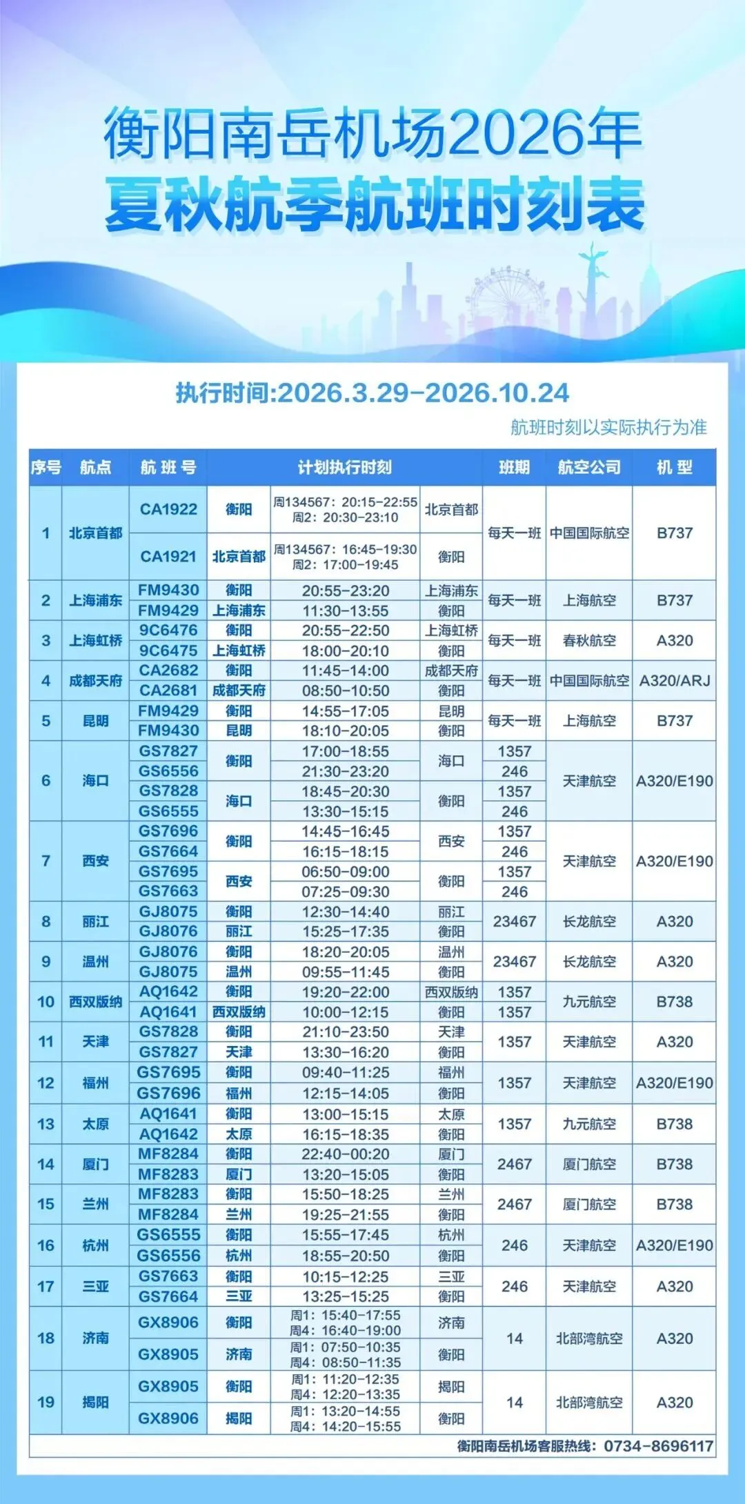 南岳机场2026年夏秋航季航班时刻表