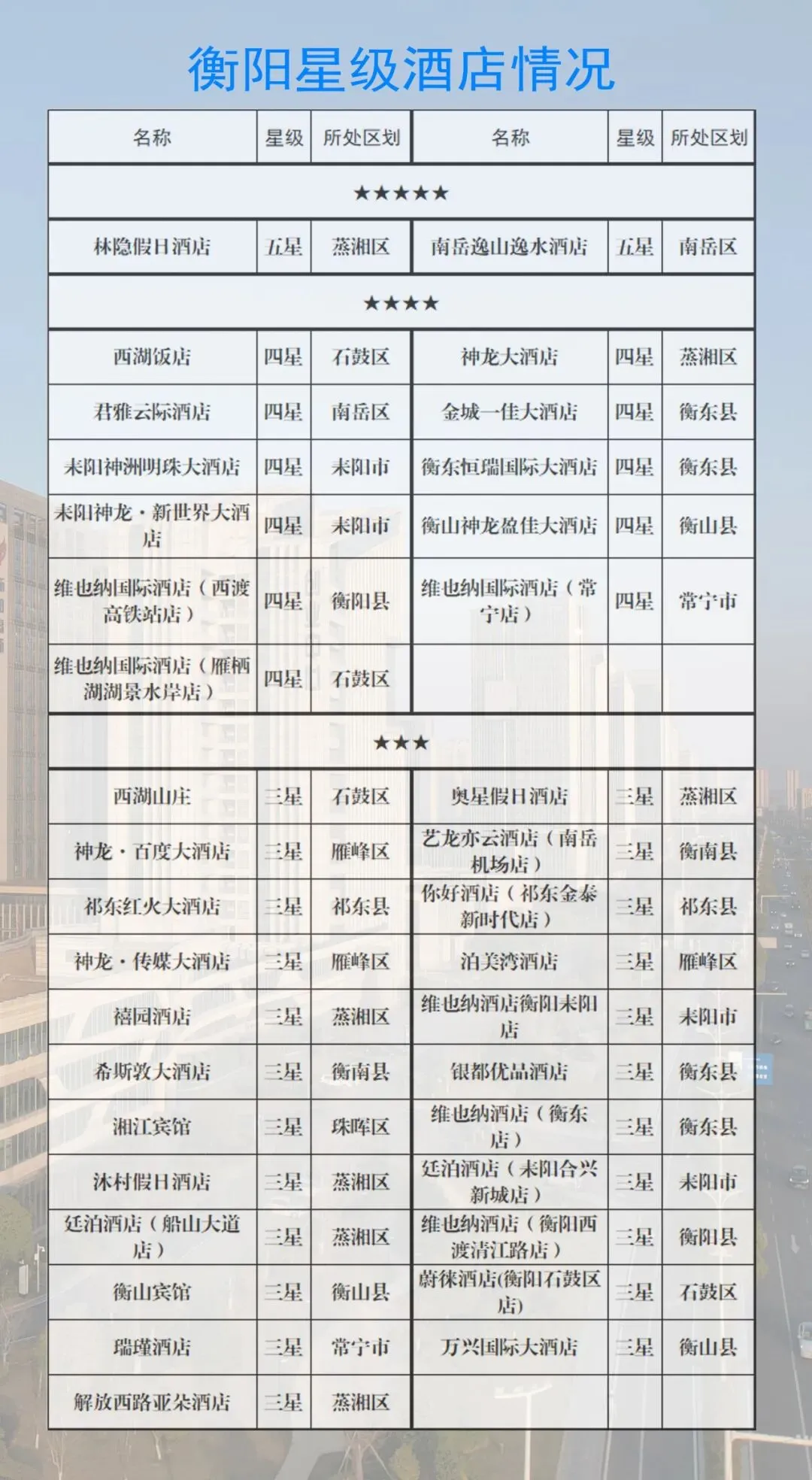 神龙大酒店、耒阳神洲明珠大酒店、衡东恒瑞大酒店、耒阳神龙·新世界大酒店、西湖饭店、衡山神龙盈佳大酒店、南岳君雅云际酒店、金城一佳大酒店、维也纳国际酒店(西渡高铁站店)、维也纳酒店(常宁店)、维也纳国际酒店(雁栖湖湖景水岸店)
