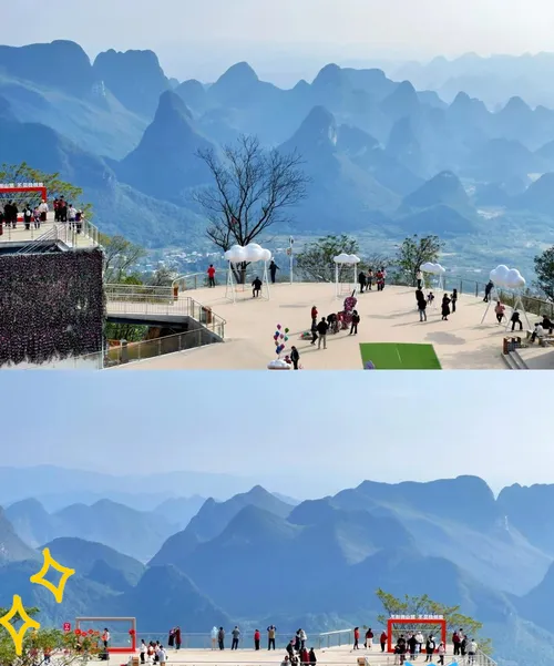 到了山顶,有条空中曲桥,这是尧山最出片的地方,很多人冲着这个来,桥修在两座山峰之间,底下是悬崖和树林,走在上面风特别大,脚下是镂空的玻璃栈道,往下看能看到山涧和云雾,很多人在这儿拍照,摆各种姿势,但你要是走完整座桥,会发现这个桥的设计特别讲究,它不是直的,是弯弯绕绕的,像是故意让你慢下来,让你一边走一边看两边的风景,看脚下的云,看远处的漓江和桂林城,这个设计很聪明,它把"桥"这个工具性的东西,变成了一次完整的体验,你不是在过桥,是在用身体丈量天地之间的那段距离。