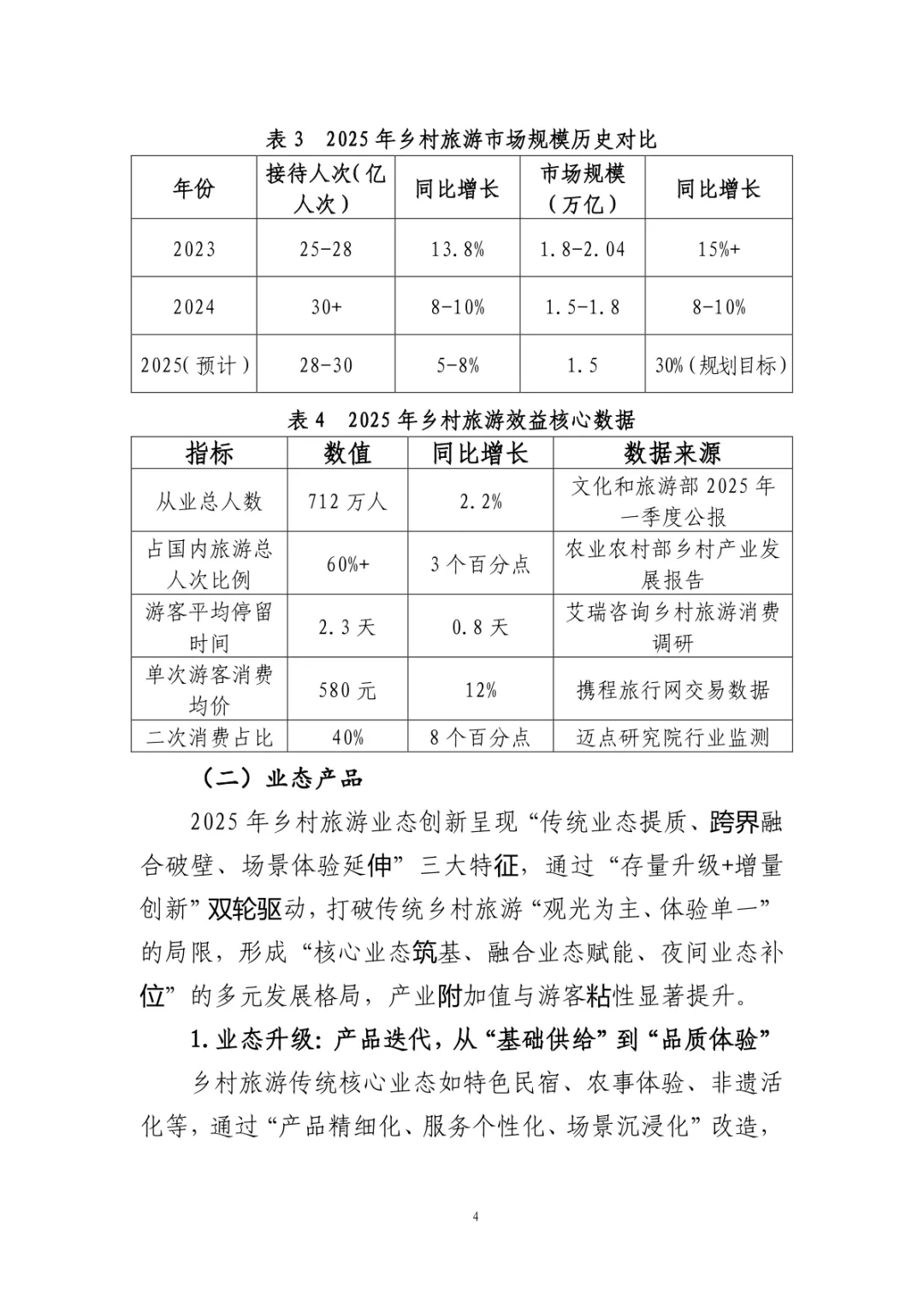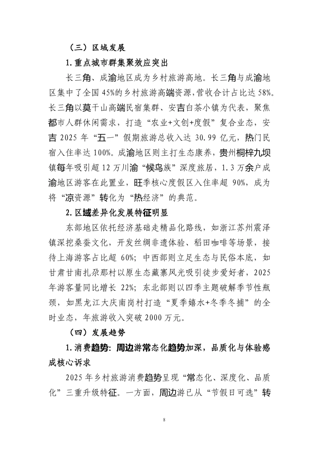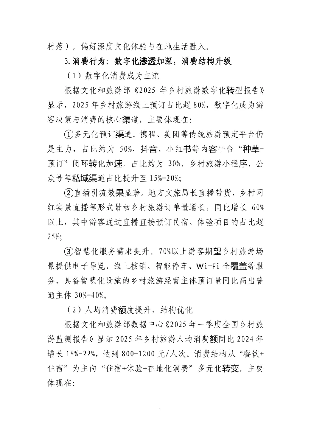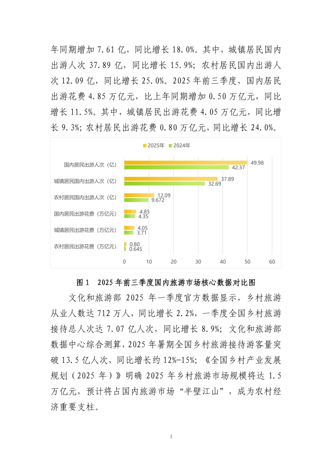 导读:2025 年度乡村旅游业发展报告显示,乡村旅游在国家政策支持下成为乡村振兴重要支柱。前三季度国内旅游市场稳步增长,乡村旅游接待人次与消费规模持续扩大,市场规模有望达到 1.5 万亿元,占据国内旅游半壁江山。从业人数稳定增加,游客停留时长与消费均价同步提升,产业带动效应显著。乡村旅游业态呈现多元创新态势,传统民宿、农事体验完成品质升级,农文旅、康养、研学、体育等跨界融合项目快速增长。夜间经济成为新增长点,有效延长消费链条。区域发展格局清晰,长三角与成渝地区集聚高端资源,东中西部依据资源禀赋走差异化发展路径。行业仍面临同质化竞争、人才短缺、设施不均、生态压力、品牌薄弱等挑战。浙江安吉、重庆厚坪乡、云南双廊镇提供特色发展范本。报告从政策、产业、支撑体系提出对策,通过精准赋能、业态创新、数字升级、人才引育推动行业向精品化、品牌化、可持续方向高质量发展。