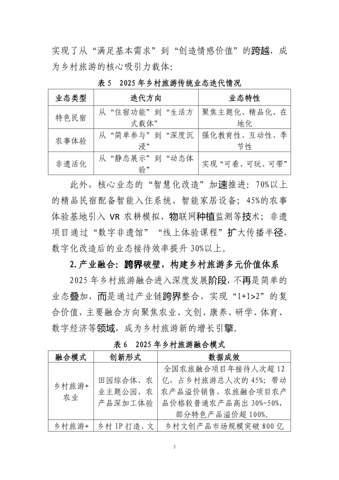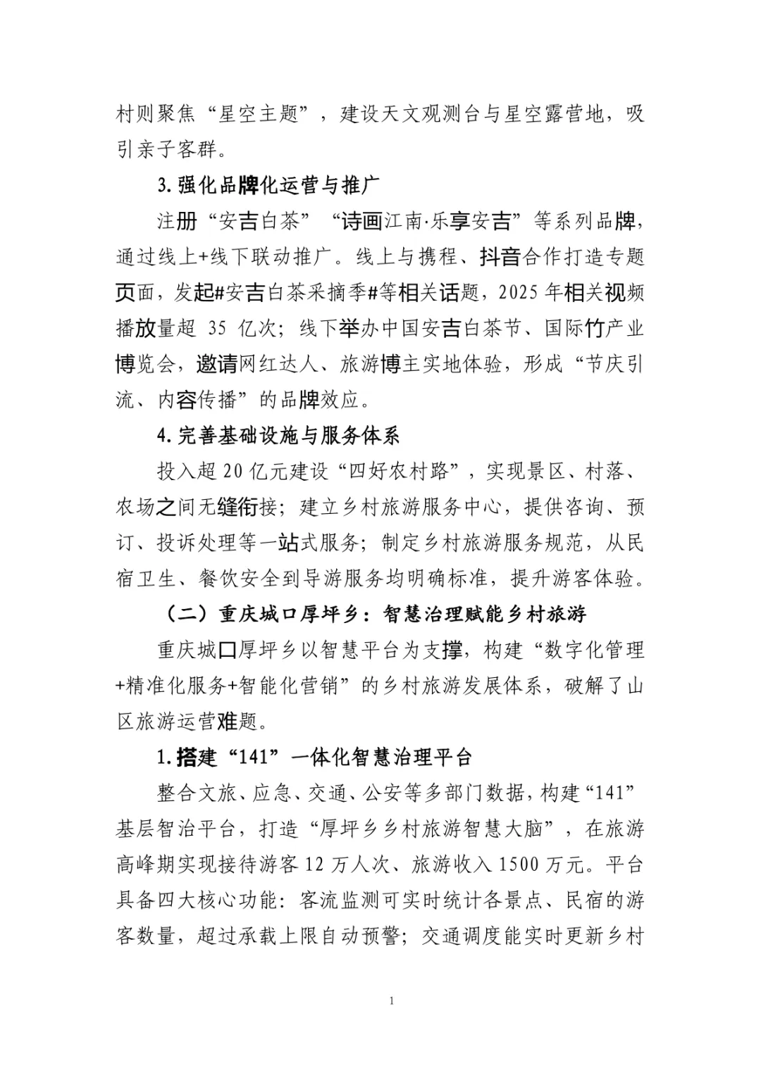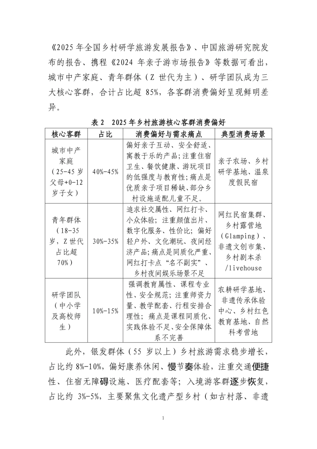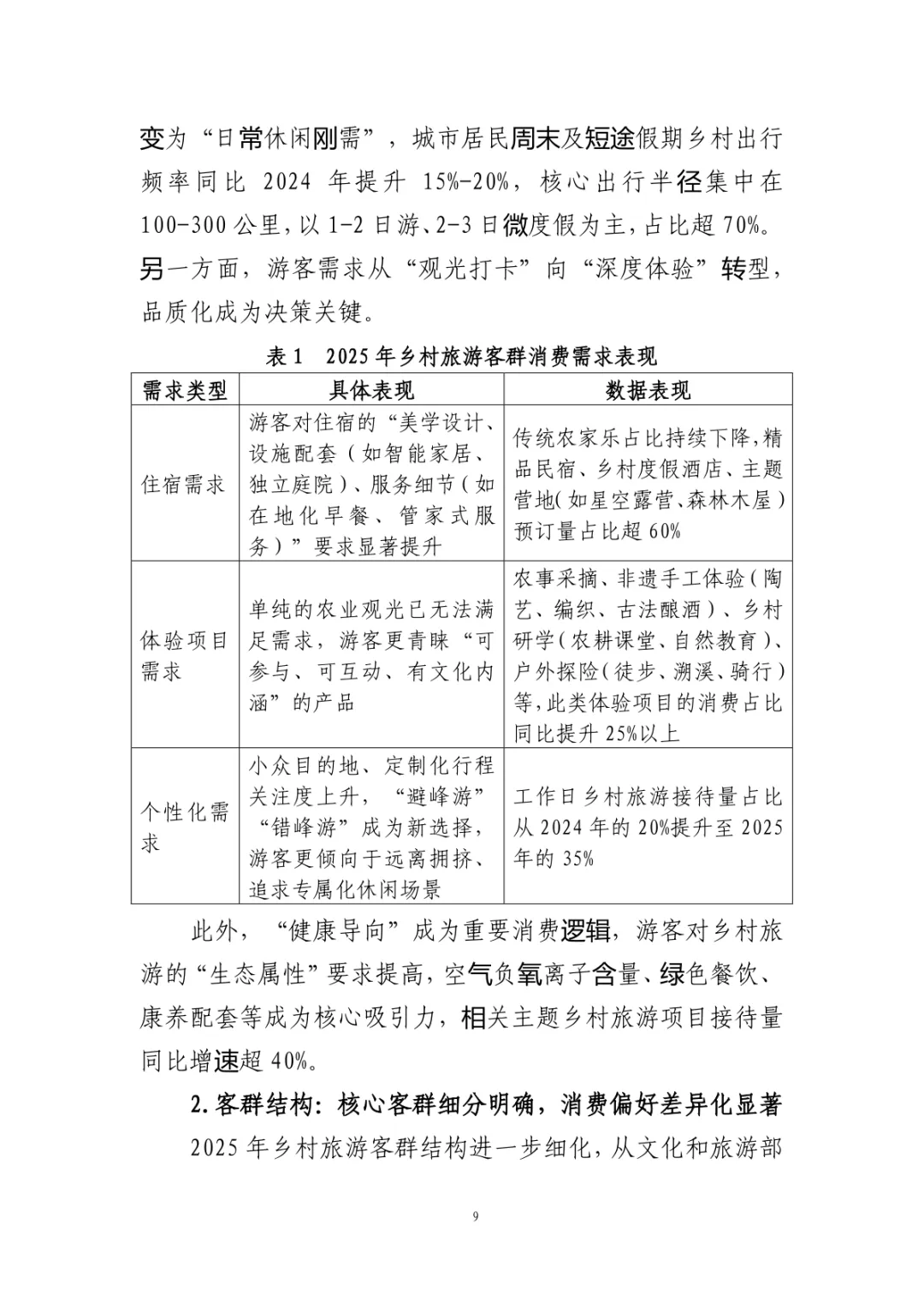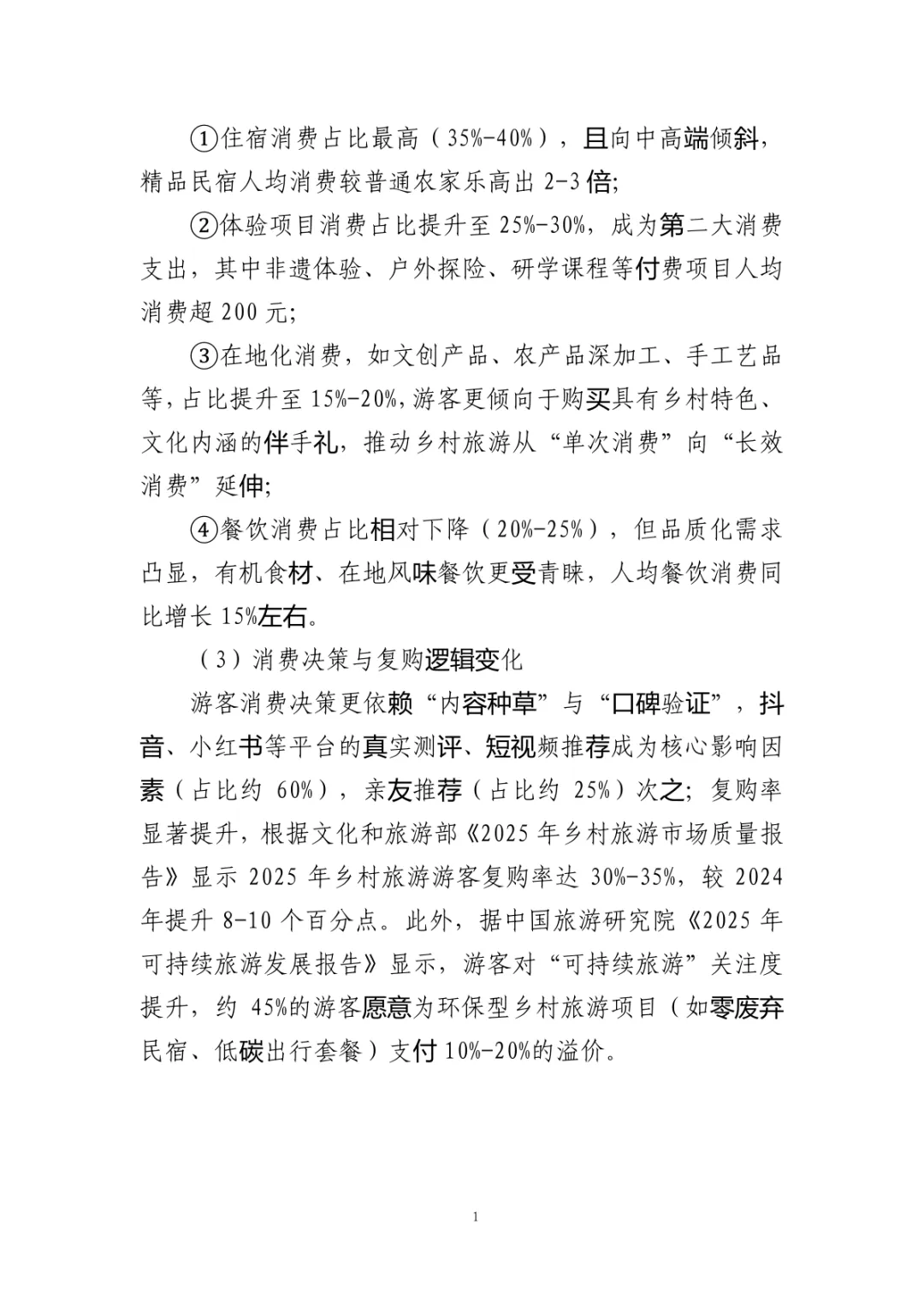 导读:2025 年度乡村旅游业发展报告显示,乡村旅游在国家政策支持下成为乡村振兴重要支柱。前三季度国内旅游市场稳步增长,乡村旅游接待人次与消费规模持续扩大,市场规模有望达到 1.5 万亿元,占据国内旅游半壁江山。从业人数稳定增加,游客停留时长与消费均价同步提升,产业带动效应显著。乡村旅游业态呈现多元创新态势,传统民宿、农事体验完成品质升级,农文旅、康养、研学、体育等跨界融合项目快速增长。夜间经济成为新增长点,有效延长消费链条。区域发展格局清晰,长三角与成渝地区集聚高端资源,东中西部依据资源禀赋走差异化发展路径。行业仍面临同质化竞争、人才短缺、设施不均、生态压力、品牌薄弱等挑战。浙江安吉、重庆厚坪乡、云南双廊镇提供特色发展范本。报告从政策、产业、支撑体系提出对策,通过精准赋能、业态创新、数字升级、人才引育推动行业向精品化、品牌化、可持续方向高质量发展。