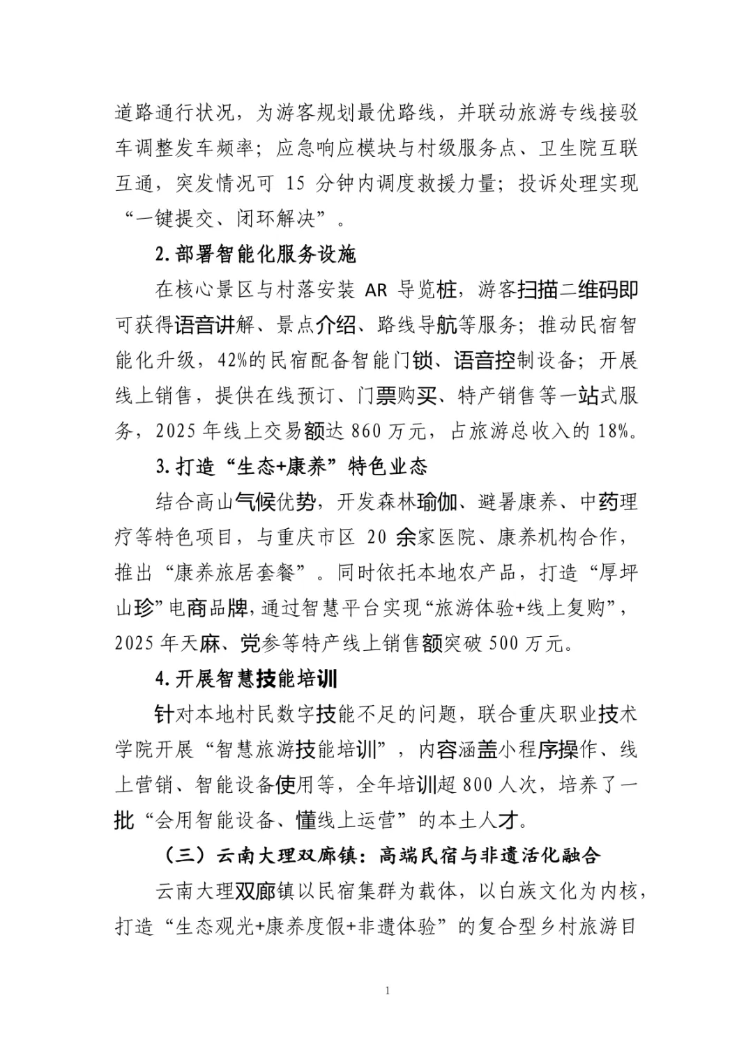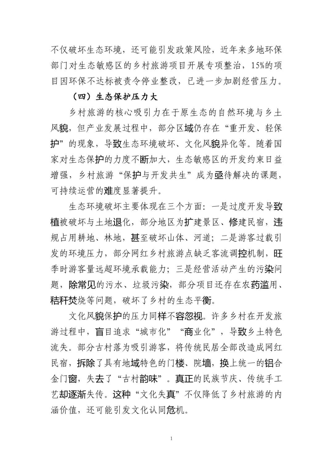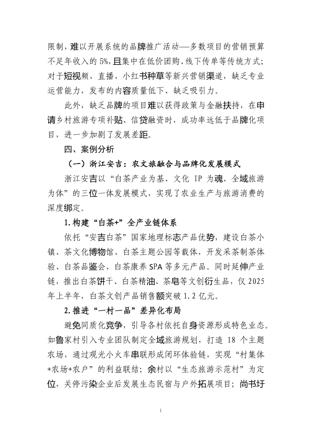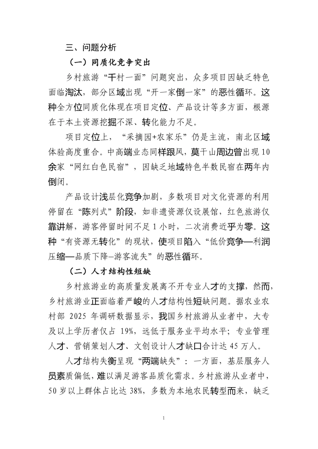 导读:2025 年度乡村旅游业发展报告显示,乡村旅游在国家政策支持下成为乡村振兴重要支柱。前三季度国内旅游市场稳步增长,乡村旅游接待人次与消费规模持续扩大,市场规模有望达到 1.5 万亿元,占据国内旅游半壁江山。从业人数稳定增加,游客停留时长与消费均价同步提升,产业带动效应显著。乡村旅游业态呈现多元创新态势,传统民宿、农事体验完成品质升级,农文旅、康养、研学、体育等跨界融合项目快速增长。夜间经济成为新增长点,有效延长消费链条。区域发展格局清晰,长三角与成渝地区集聚高端资源,东中西部依据资源禀赋走差异化发展路径。行业仍面临同质化竞争、人才短缺、设施不均、生态压力、品牌薄弱等挑战。浙江安吉、重庆厚坪乡、云南双廊镇提供特色发展范本。报告从政策、产业、支撑体系提出对策,通过精准赋能、业态创新、数字升级、人才引育推动行业向精品化、品牌化、可持续方向高质量发展。