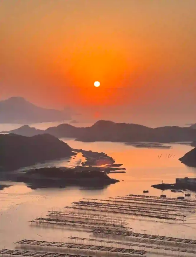 摄影师们藏着掖着不肯告诉别人的地方。四五月正是海带丰收的季节,滩涂上竹竿林立,日出日落时金光洒满海面,美得像一幅水墨画。
