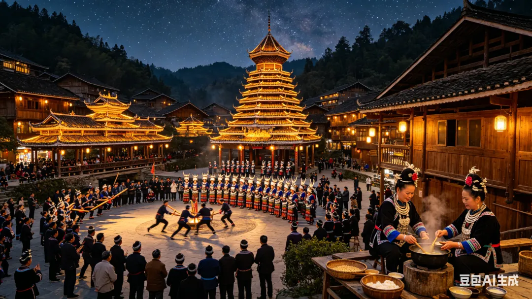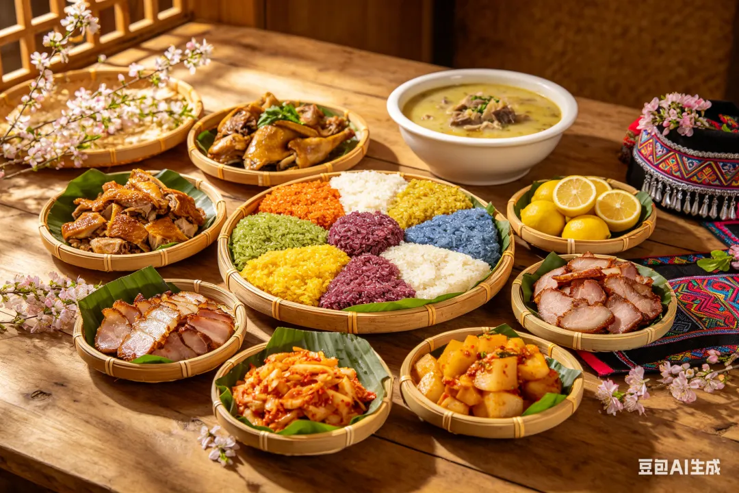 - 长桌宴 + 篝火:拦门酒、油茶、五色饭,载歌载舞到深夜