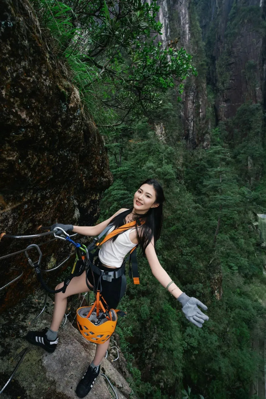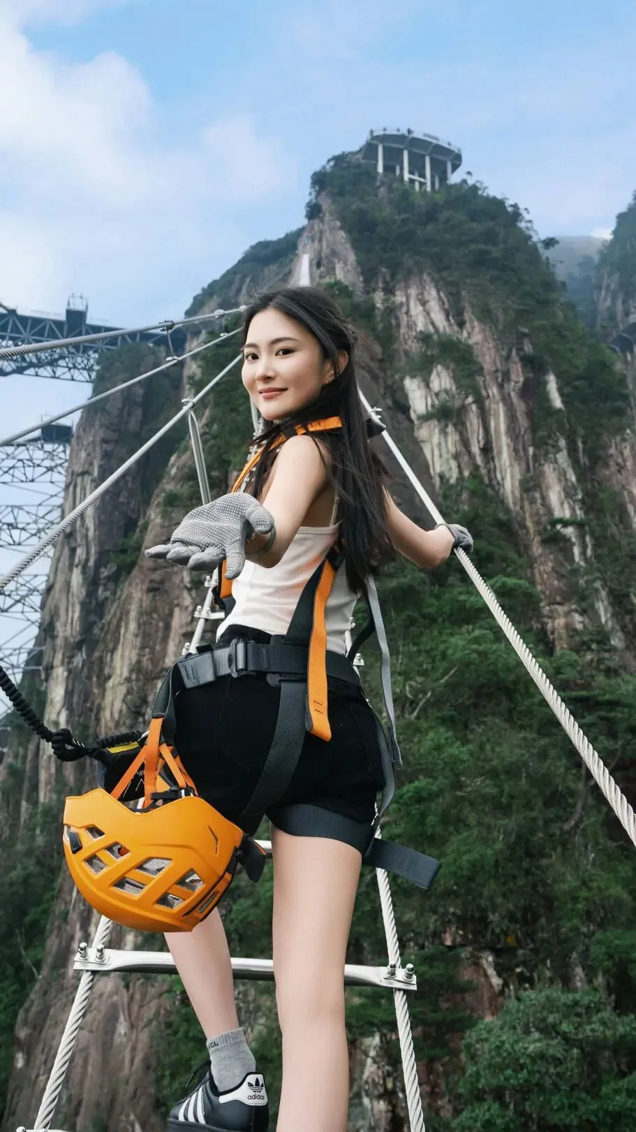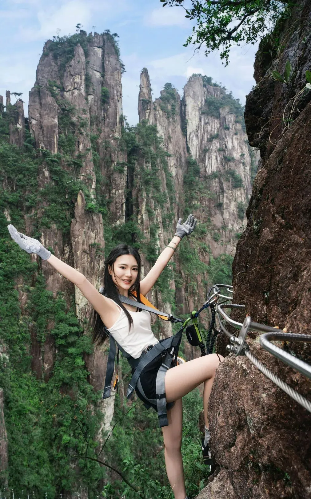 出片动作:身体微微后仰靠住安全绳,找一个相对平稳的落脚点,做一个简单的伸展动作,双手张开,拥抱天空,下巴微抬,表情漫不经心,仿佛在说:“就这?”