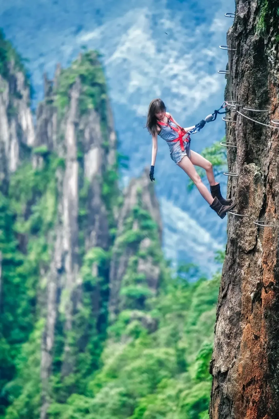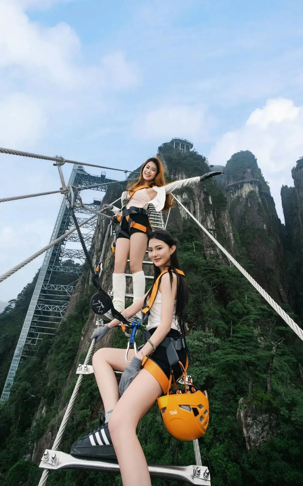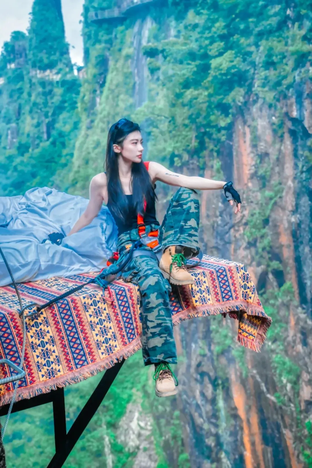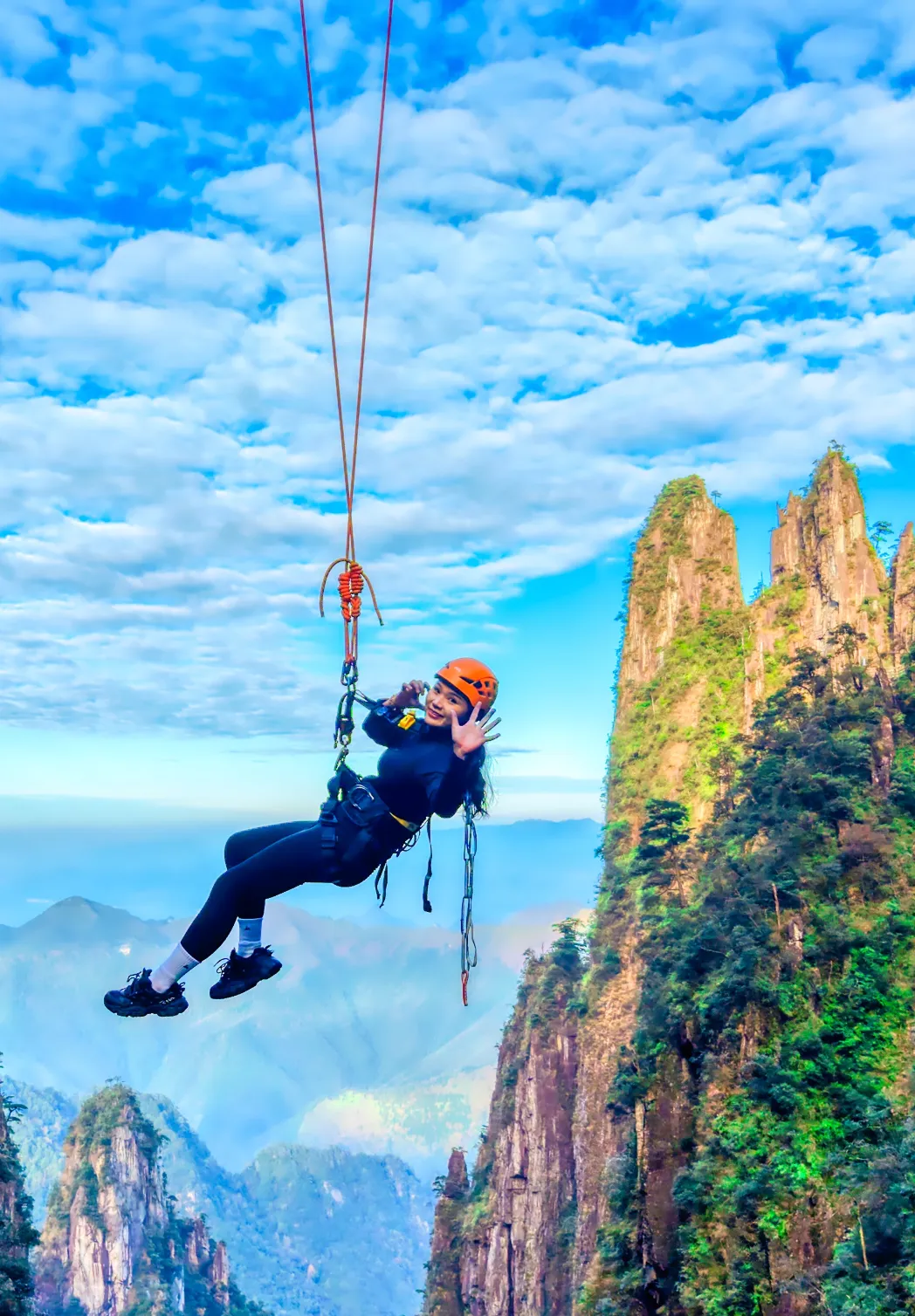 出片动作:身体微微后仰靠住安全绳,找一个相对平稳的落脚点,做一个简单的伸展动作,双手张开,拥抱天空,下巴微抬,表情漫不经心,仿佛在说:“就这?”